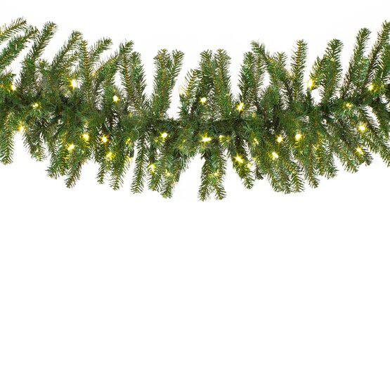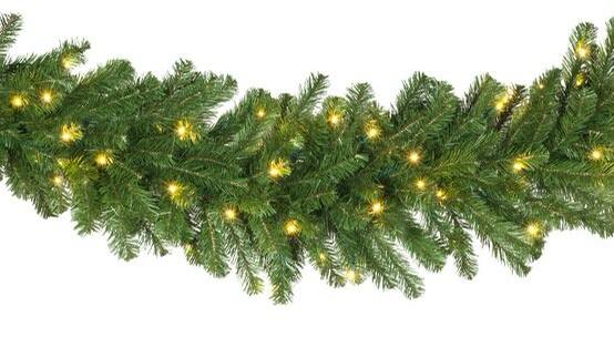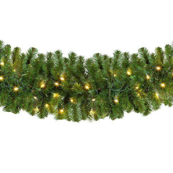 Thick and sturdy, this commercial grade garland features dark green foliage and is pre-lit with energy-saving warm white LED lights.