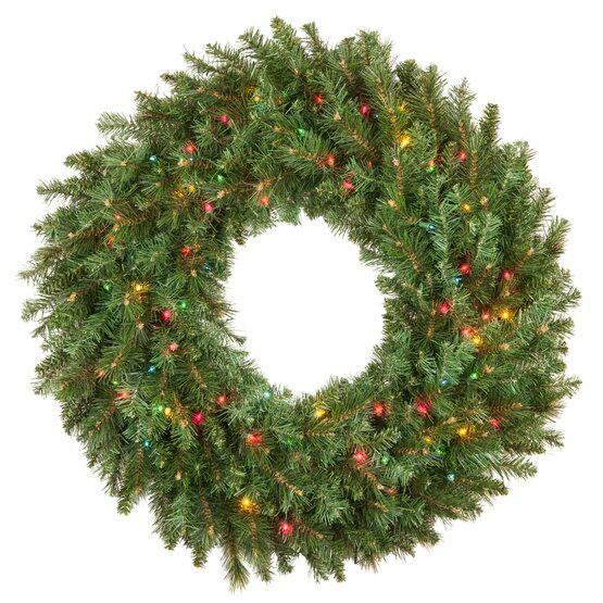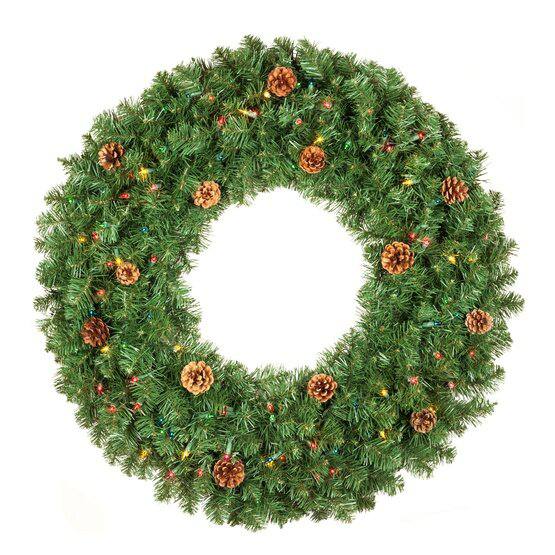 With its thick fluffy needles and pinecones, this wreath is sure to bring the winter forest to your home. Available pre-lit with either clear or multicolor lights.
