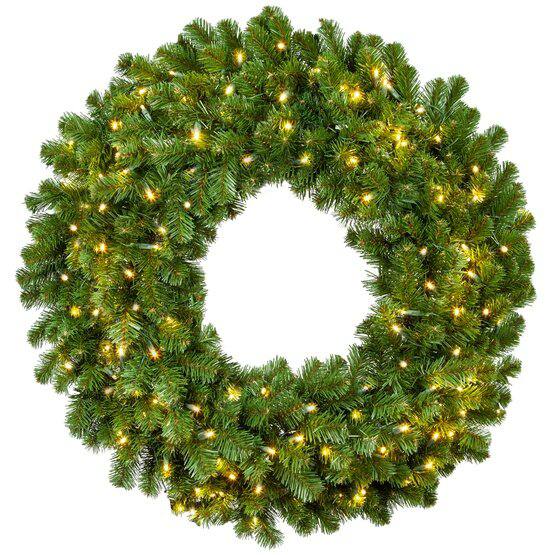 A sturdy, commercial grade artificial wreath that can withstand the elements if displayed outdoors. Prelit with warm white miniature LED lights.